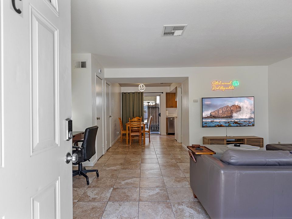 This is a fully furnished and remodeled unit intended for work force housing with at least 30 days and longer stay. New cabinets/counters floors, fresh paint. There are 3 bedrooms, 2 with queen beds and a third with 2 twin beds. There is a bathroom with tub/shower. The master bath has a shower and downstairs there is a 1/2 bath. This unit has excellent central AC/ heating. The price include utilities (with caps), free onsite use of laundry room and a 2 car garage. Very close to NAWS and the hospital. Across the street to supermarket.