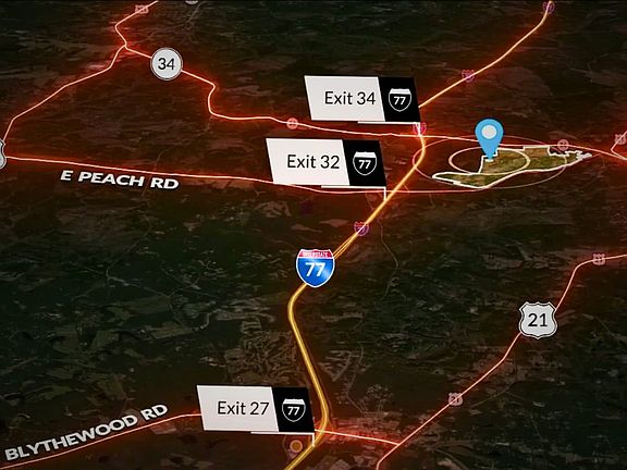 Bound by I-77 and the Town of Ridgeway, the property features four distinct frontage points along Highway 34, Peach Road, South Coleman Street, and Mt. Hope Road, ensuring maximum visibility and access flexibility. A centrally located pond, favorable topography, and well-drained soils further enhance the site's development efficiency and versatility.
