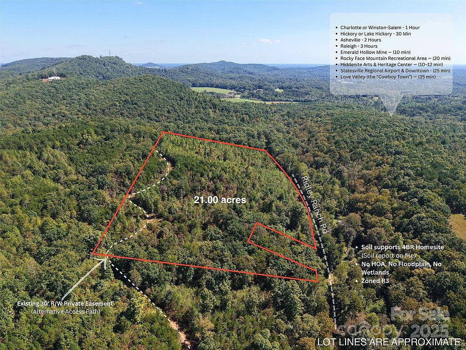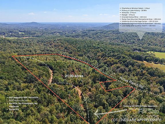 Discover a rare 21-acre parcel in Alexander County, NC, zoned R3 and ideal for a custom estate, mini-farm or investment build-out. Located on a quiet ranch access road in the Hiddenite area, this property features no HOA, gently rolling terrain with 0% wetlands and lies outside any flood zone. Utilities require well and septic installation; a current soil report on file confirms approval for a 4-bedroom home. Enjoy convenient access: