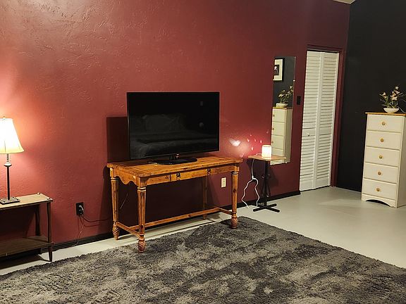Kitchen area has kitchen table, air fryer, single burner portable induction cooktop, microwave, toaster, coffee pot, and fully loaded with almost anything you need. TV with Roku.