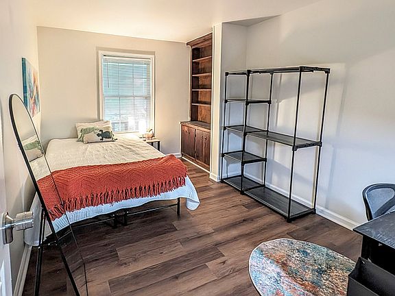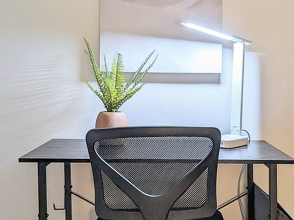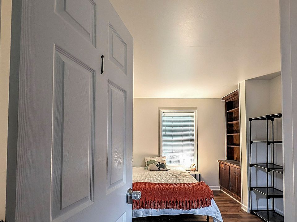 This room has a built-in bookcase to display your books and decorations! Additional built-in cabinets are great for storage. Comes with full length mirror, desk and chair, 3 lamps, room darkening curtains, and a coffee maker!