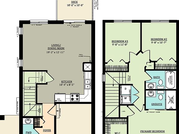 -1,350 Sq. Ft.-Covered Front Porch-3 Bedroom Two-Storey Townhome-9'-0" Ceiling Height on Main Floor, 8'-0" Ceiling Height on Second Floor-Quartz Countertops in Kitchen-Open Plan Kitchen and Living/Dining Room-Engineered Hardwood Flooring in Living/Dining Room, and Kitchen-Tile Flooring in Foyer, Powder Room, Primary Ensuite Bathroom, Main Bathroom, and Laundry Closet-Living/Dining Room opens to a 10'-0" x 10'-0" Rear Pressure Treated Wood Deck-Primary Bedroom with Walk-In Closet and 3-Piece Ensuite Bathroom-Second Floor Laundry-Attached 9'-10" x 20'-8" Garage with inside entry-Central Air Conditioning
