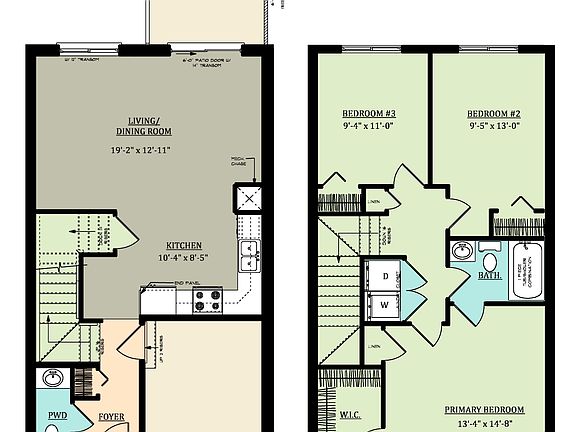 -1,310 Sq. Ft.-Covered Front Porch-3 Bedroom Two-Storey Townhome-9'-0" Ceiling Height on Main Floor, 8'-0" Ceiling Height on Second Floor-Quartz Countertops in Kitchen-Open Plan Kitchen and Living/Dining Room-Engineered Hardwood Flooring in Living/Dining Room, and Kitchen-Tile Flooring in Foyer, Powder Room, Main Bathroom, and Laundry Closet-Living/Dining Room opens to a 10'-0" x 10'-0" Rear Pressure Treated Wood Deck-Primary Bedroom with Walk-In Closet and Direct Access to Main Bathroom-Second Floor Laundry-Attached 9'-10" x 20'-8" Garage with inside entry-Central Air Conditioning