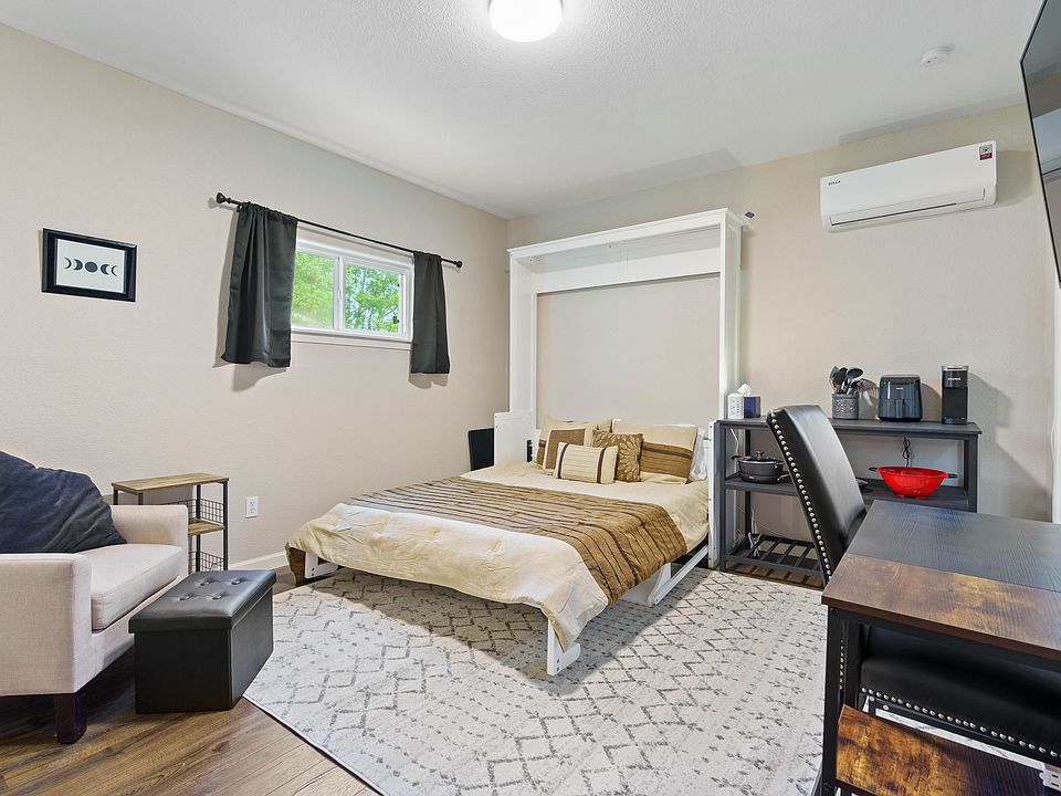 Tired of hotels? Foam mattress queen bed can be raised when more space is desired. A huge 50 inch 4K smart TV to stream your own preferred services. A private bathroom. Fridge, microwave, induction cooktop, air fryer, electric kettle and a Keurig. Of course it is stocked with basic spices, various dishes and utensils. You have an assigned covered parking spot on site. Enjoy the west-facing back patio in the evenings overlooking splendid pecan trees. Shared free laundry on-site. One person only. No pets.