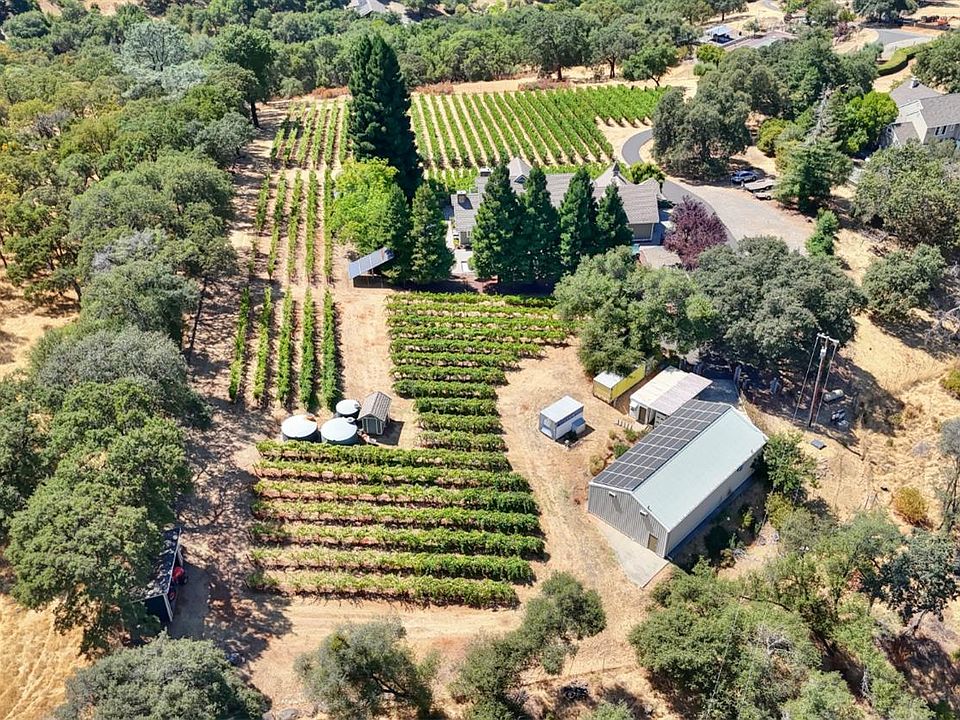 Stunning custom estate situated on 5 acres with 2.5 acres of producing vines and owned solar! Tucked behind a private road and gated entrance, this home offers sweeping views of the valley and Folsom Lake. With over 4,000 sq. ft. of living space, highlights include a private office with separate entrance and a beautifully remodeled kitchen with Sub-Zero refrigerator and freezer. Designed for both everyday living and entertaining, the property features a bocce ball court, covered pergola, exterior pavers, dog run, and back-up generator. A 75-year Bartile roof combines timeless style with lasting durability. The impressive 1,800 sq. ft. refrigerated buildingpreviously used as a wine cellarprovides endless flexibility for wine storage, custom cars, a workshop, or warehouse space. The primary suite boasts a private balcony and sitting room with sweeping views. Fully fenced with no HOA or CC&Rs, this estate is the perfect blend of privacy, function, and breathtaking scenery!