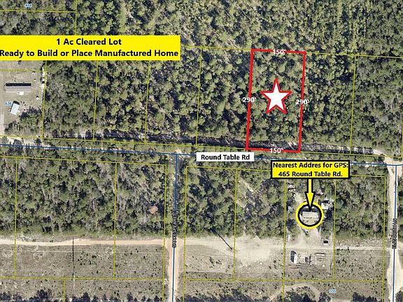 1 acre cleared lot in fast growing Mossy Head area of Deufuniak Springs. Located apx. 10 minutes from downtown Defuniak Springs; 3.5 mi. from Blackstone Golf Course and 4.5 mi. to I-10 in Mossy Head for a quick commute to Crestview, Eglin AFB, Niceville and Ft. Walton Beach Airport. Lot has been cleared and ready to build or have a manufactured home set up. No utilities currently on the property. Power runs along Round Table Rd. Septic tank and well would be required. Survey has been completed and corners are clearly marked with flagged stakes.