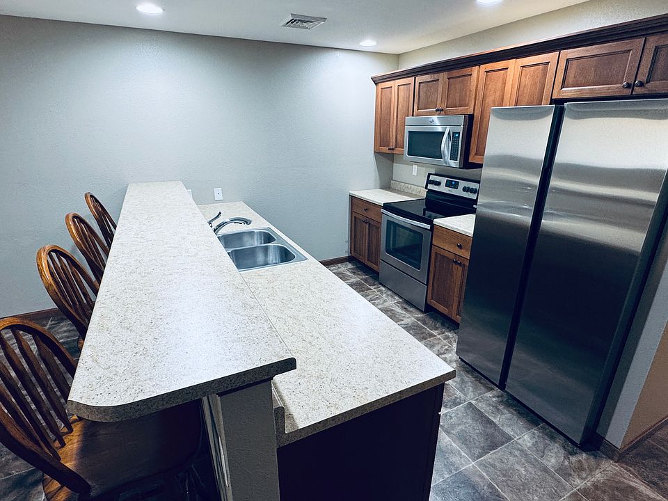Sleek Kitchen Galley-style kitchen with all stainless steel appliances and a breakfast bar with seating for four.