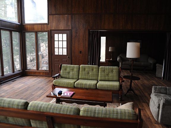 Cabin #4 is a well-maintained wood frame building built in 1980 chalet style by the current owner. It has never been listed for sale. Electric power is underground. The cabin has a well, septic system, and propane tank and direct access to South Mac Road, which is plowed in winter and maintained year-round by Lake County. It was built chalet style in 1980 prior to the Natural Rivers Act, when the setback from to the river was 40'. That is 110' closer to the river than is now allowed under Natural Rivers zoning. It is grandfathered, and may be replaced or expanded up to 50% without a zoning variance. The main floor has a two-floor high great room above the river, a kitchen and dining area with a built-in dishwasher, a den or bedroom, a full bathroom, and a utility room on the main floor. The upper floor has two full bedrooms and a full bathroom, with an open area above the living room below. The total living area is 1,872 square feet, larger than the other cabins at Cannon River Ranch. The interior finished with paneling, drywall, and laminate wood pattern floor coverings. The exterior siding is wood, and the roof is metal. Sliding doors lead to expansive deck areas offering peaceful views of the Pere Marquette River upstream and downstream. You will see eagles, deer, otter, and grouse. The Pere Marquette is a National Wild and Scenic River, a Natural River with no dam, and a Blue Ribbon Trout Stream in Michigan. It is recognized as one of the few trout and salmon fishing rivers of this quality remaining in the nation. This river was the location of the first brown trout introduction in the United States in 1884. Rainbows were planted in 1885. Today, the river also provides world-class fishing for steelhead and Chinook salmon. The river on this parcel includes some of the best fishing water on the property.
