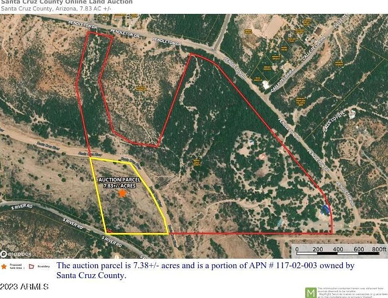 SANTA CRUZ COUNTY SURPLUS REAL ESTATE ORDERED SOLD AT PUBLIC AUCTION! The proposed sale area is a 7.83+/- parcel that is the portion of the Santa Cruz County Calabasas Park located on the south side of the Santa Cruz River with frontage on the north side of River Rd (directly across the street from 437 S River Rd, Nogales, AZ 85621). This is a unique opportunity to purchase a piece of recreation property with panoramic mountain views and ready to host all your outdoor fun! Power is available within a short distance and access from River Rd. Many usage possibilities with this land parcel such as for ranching cattle, boarding horses, setting up the camper/RV, or bringing your toys for weekend fun. Property will be sold at live public auction. Click ''More'' for more info... GPS coordinates for the southwest corner of the parcel are (31.43003204066032, -110.92669887197034). See MAPS for further information on the parcel location.
