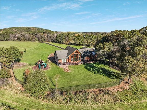 This property has it all! A lovely custom Wis. home situated on 40 gorgeous acres with/ Beaver Creek trickling through the backyard! Just minutes south of EC and Eau Claire schools- Memorial/South/Robbins! You'll enter the front door to a million-dollar view!! Features include a huge master suite with WIC, vaulted ceilings, massive field rock fireplace, geothermal heat and a/c, heated oversized 3 car garage with basement entrance, chef's kitchen with Sub Zero freezer and refrigerator, Wolf cooktop, huge laundry/mudroom, grand dining rm w/ stained glass window from St. Raymond's - that could be a home office w/ separate entrance! The floor-to-ceiling windows offer tons of natural light, adding to this home's grand design! The LAND- this 40-acre spread includes... a new fruit tree orchard, honey bee garden, a new 2025 custom chicken coop w/ 10x10 hen house, a flower/veg garden, open fields, crops, and a trail over the Creek! New sprinkler system surrounding the home. Exterior Log was professionally conditioned and sealed in 2023.