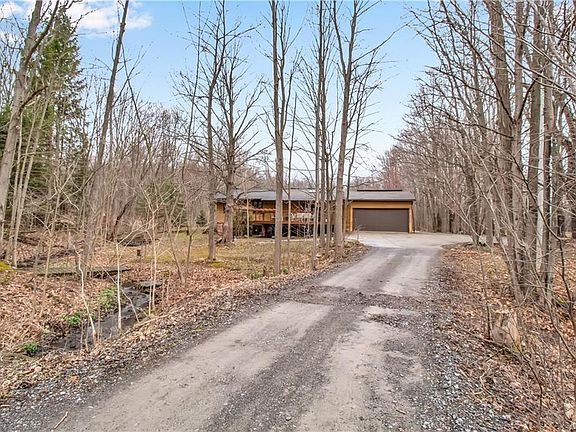 Babbling brook, spring peepers, fireflies, golden leaves and snow globe days: a light-filled custom home built to appreciate the sights and sounds of our four seasons. Country neighbors and wooded privacy included on over 7 acres of mature trees. Peaceful living with the convenience of easy access to major routes: a location that is the best of both worlds. Custom woodwork, maple floors, natural wood cabinets, brick accent walls provide the backdrop to make this your home. Amenities include solar panels, radiant floor heat in kitchens/baths, spacious deck and patio. Updates include boiler and hot water tank in 2018. Total square footage of 2424 includes 842 sq ft of the walkout, heated and finished lower level. Do not hesitate on this real estate opportunity.