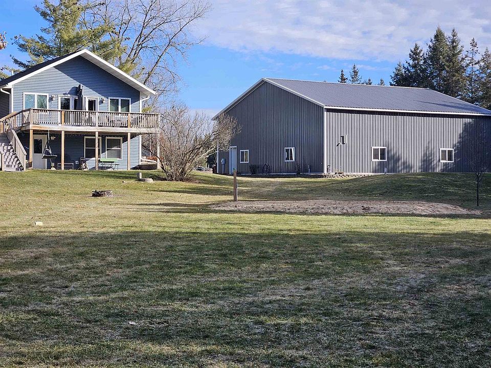 Very well-maintained 5-bed, 3 bath home with 2 acres on the outskirts of Reedsburg. Home features in-floor heat, stainless steel appliances, granite counter tops, Large 7' x 5' kitchen island with build in cooktop and Cherry cabinets throughout. Master bedroom has walk in tile shower with built in closet shelving. A large deck with composite decking overlooking the pond and pad for above ground pool with power trenched to it. Lower level has rec room with kitchen area and walkout to the back yard. Partial area in the back is fenced off for child's play area or a place to let the dogs run and stretch their legs. Home was completely remodeled in 2015 with updated wiring and plumbing. Property has an insulated 50x48x14' shop with in-floor heat, 3 overhead doors with openers and floor drain.