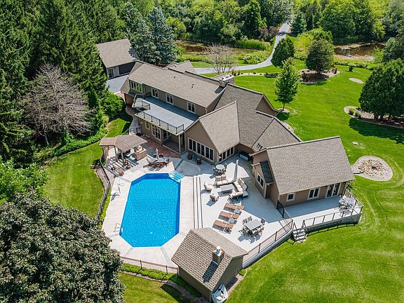 Experience refined luxury in this exceptional executive retreat set on a breathtaking 20-acre private paradise with serene woods & tranquil ponds. Thoughtfully expanded in 2018, the home features a stunning main-level primary suite designed for comfort and privacy. The second level offers a spacious guest or in-law suite plus three additional bedrooms, ideal for family or visitors. The exterior blends synthetic stone and cedar for timeless appeal with easy care. Entertain effortlessly in the huge, beautifully updated kitchen, or retreat to the spectacular lower level complete with game room, full bar and kitchen, custom display areas for treasured collections & private golf simulator. Outdoors, enjoy summers by the in-ground pool with an enormous deck overlooking nature. 5+ car garage.