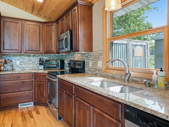 Rec roomHuge great roomSpacious dining areaUnique window-filled garage doorGlass-tile backsplashUpscale kitchenWood vaulted ceiling