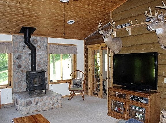 The home is located at the end of the road and surrounded by mature hardwood trees and alive with wildlife. From birds to deer you'll enjoy watching it all while sitting on the covered front porch. Once inside you'll be impressed with all the custom features as well as quality throughout. The impressive eat-in kitchen offers Kraft Maid custom cabinets with rain glass inserts and quartz countertops, tiled floors, knotty pine cathedral ceilings with diffused skylights and a gorgeous wood burning fireplace. French doors from the kitchen area lead to the spacious and light filled living room complete with a wood burning stove on a stone raised platform. The current owners use this efficient woodstove as their main heat source during the winter and therefore save hundreds of dollars in heating costs.The charming 3 season porch located just off the living room has ceramic tile floors and knotty pine walls and ceilings.dynamic views are included.From the other side of the kitchen is where you will find the bedrooms, a small work area, stairway to the lower level and a bathroom with a walk in shower stall. The Master bedroom features ample closet space and a cute master bath with a jetted Jacuzzi tub for relaxing after a long day. The second bedroom is also located at this end of the home offering nice views and a closet with pocket doors.The lower level has a finished family room which would have the potential of being a 3rd bedroom if needed. Here is also where the 2 car tuck under garage is accessed from inside the house. There's also another bathroom with a shower stall and a large storage room where the mechanicals and laundry area are located.The wooden bridge across the dry ravine leads to a wonderful picnic area where friends and family will enjoy gathering for bonfires. The land is mostly wooded however there's certainly room for gardens and pets.