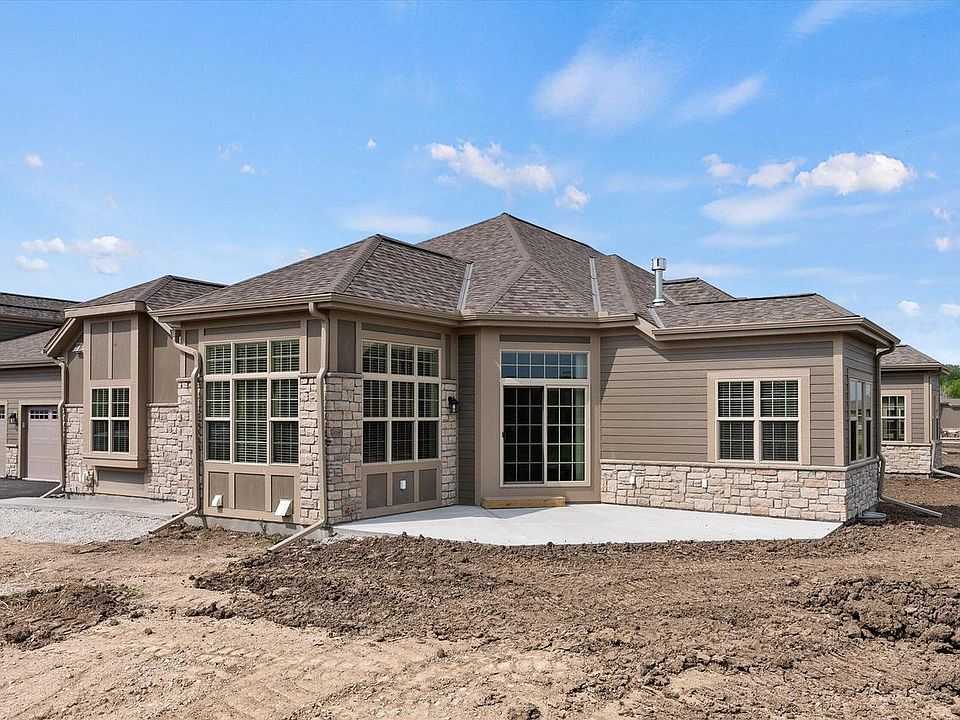 New Construction double duplex, 2BDR/2B home with 3+car garage. Open concept kitchen with island, great room with gas fireplace, dining area and sunroom.  10ft ceilings.  Unfinished lower level plumber for fill bath. Site overlooks meadow