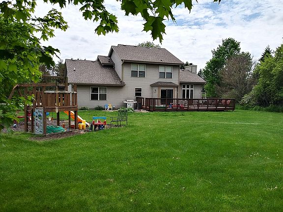 Majestic 1.5 story home on 1.3 ac. lot. Conveniently located but nestled within the natural beauty of a picturesque, wooded setting. This 3,100 sq. ft. (per assessor), 3-bed, 2.5-bath home w/ attached 2-car garage features playground, large shed & firepit at back of property. Two large decks, one surrounding a 28-foot pool w/ gazebo for outdoor entertainment. Loft could be converted to a 4th bedroom. Enormous master suite w/ walk-in closet & corner garden tub/jacuzzi. Large and open kitchen features an island, HWF & updated tile & hardware. Finished LL includes bar w/ great atmosphere for game-days, parties or a quiet place to relax. Behind the property sits over 100 acres of public lan for hiking, x-c skiing, hunting & more. Near golfing, Big Bend Park & Fox River.