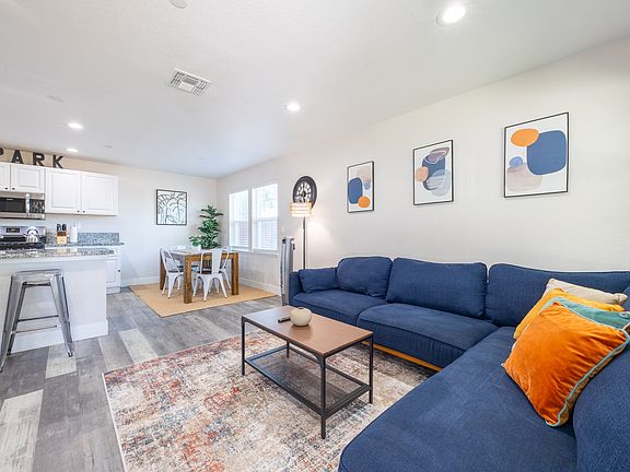 The primary bedroom features a king bed, private bathroom, walk-in closet, and dedicated workspace. Two additional bedrooms are furnished with a queen and full bed. Enjoy a spacious living area, a fully equipped kitchen, in-unit laundry, and a dining space that feels like home.