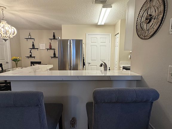 Stainless steel appliances included in charming kitchen with barstool seating. Additional dinette area seats up to 6 people.