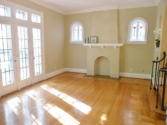 Living room 18' x 13' with Ceiling height 9"9", faux fireplace, stain glass windows, and French Doors leading to a Private Patio