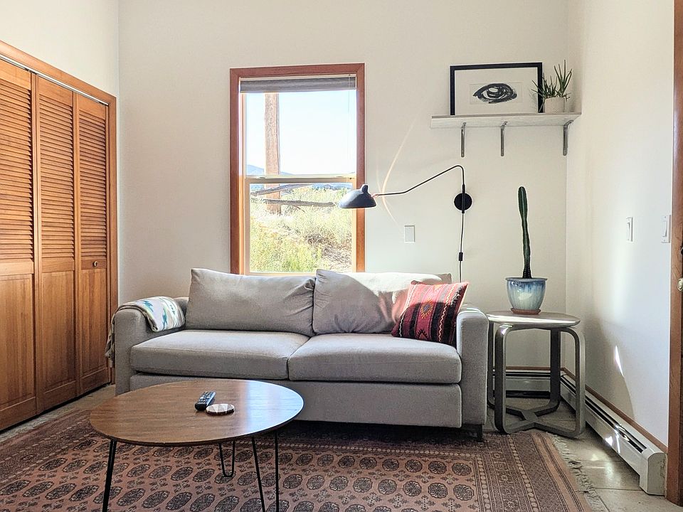 The private apartment space is a stylish, clean and cozy furnished 1 bedroom with 3/4 bath, king bed, custom built-in desk and drawer units and small private patio with two chairs. The partial kitchen includes full fridge, large sink, two electric burners, mini countertop oven, plates, glasses, cooking utensils, pots and pans, coffee mugs and microwave. Bedding and towels also included upon request. Laundry on site. Shared multi level deck and meadow with seasonal creek in the center of the property.