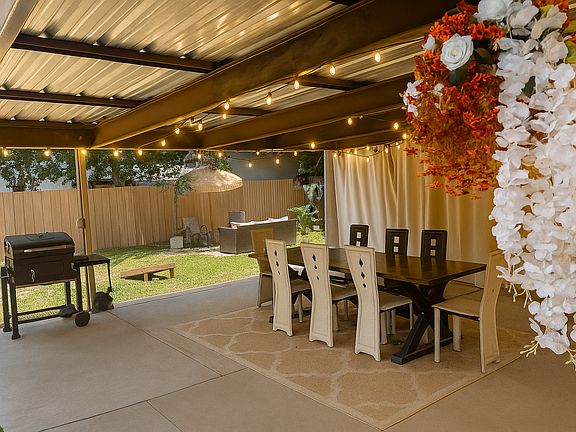 - Spacious Outdoor Dining Area: Covered patio with string lights and seating for 8 10 people, perfect for hosting gatherings.