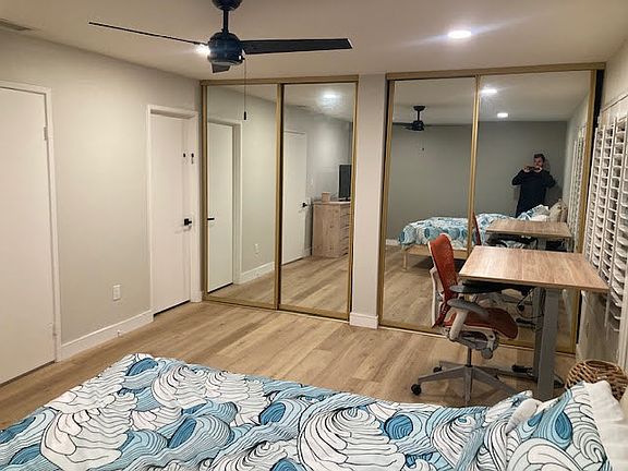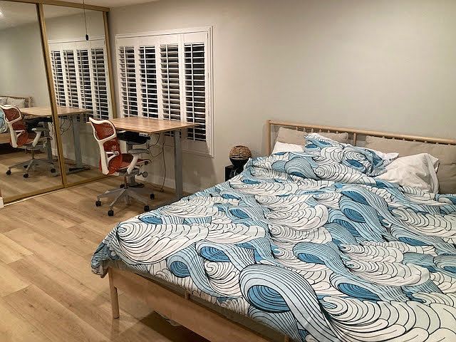 The Room: Approximately 180 sq ft, fully furnished with a queen bed, desk, chair, and two mirrored closets