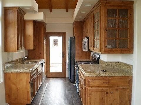 Stone fireplaceFenced backyardHigh ceilingsGranite countertopsWood floorsFlagstone patioStained glass accents