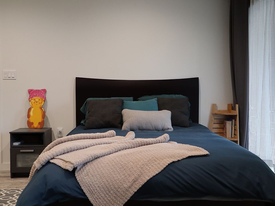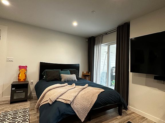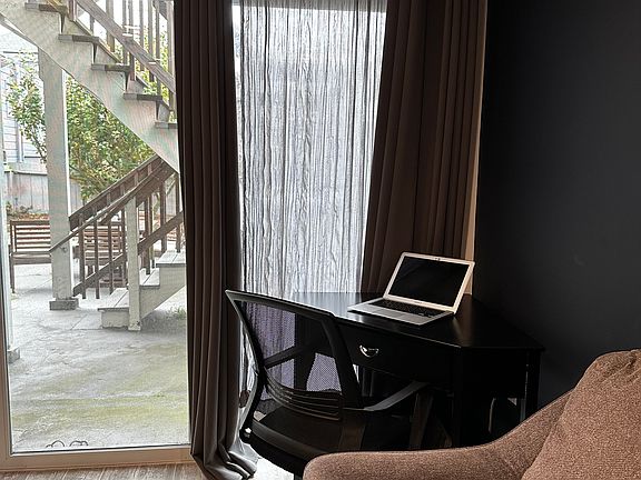 This welcoming studio has a private entrance and features an open layout with large sliding doors that open to a large shared backyard-a peaceful spot to unwind after a busy day. The generously sized studio has a clean, modern feel and includes a closet, and an additional standalone wardrobe offers extra storage. The large spa-like bathroom has double sinks, stone tile, built-in bench seating, rain shower and the spacious kitchen has sleek white cabinetry, quartz countertops, polished hardware, and stainless-steel appliances: Bosch range with hood and oven, GE dishwasher, large LG fridge. Large Samsung flat screen TV and BOSE speaker system are also included.
