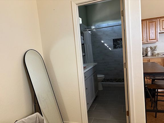 This space is separate from the main house, with its own private entrance and driveway parking (including space for an RV). Inside, the layout keeps things simple but functional. The bedroom has a queen bed, a walk-in closet, and a full-size dresser. The attached bathroom includes a single-sink vanity and a walk-in shower with modern tile. Linens are included.