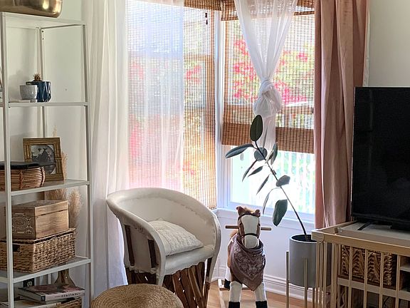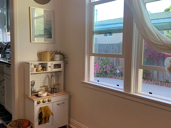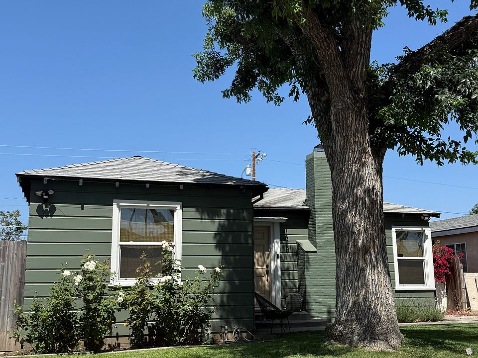 Charming 2 bedroom 1 bath home with a grassy front yard and grass and cemented backyard. Charming green exterior and recently pained bright white interior, original wood floors and architectural details with modern updates. Property has central AC and heating and includes washer and dryer.