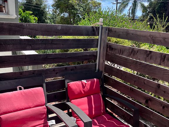 - Enter through a private gate into a fenced-in brick patio with table and comfy chairs