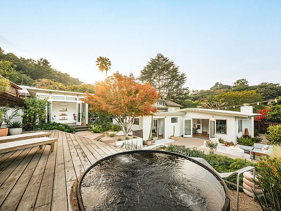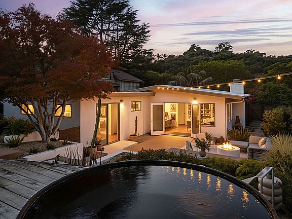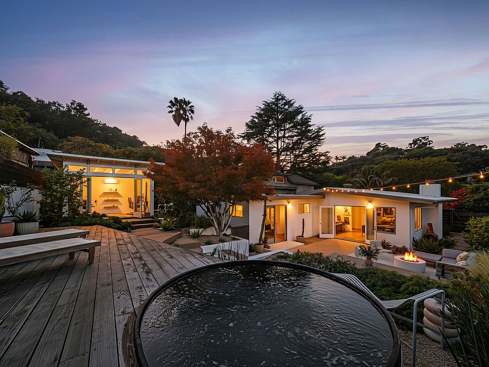 The tranquil and modern backyard is designed for private spa-like relaxation and effortless outdoor living, featuring a redwood soaking tub, gas fire pit, large outdoor dining table, and a inspiring detached studio space perfect for work or creative projects. The lush outdoor landscaping and pathways are lined with greenery and fruit trees, creating a private sanctuary with views of the sunrise & mountains!