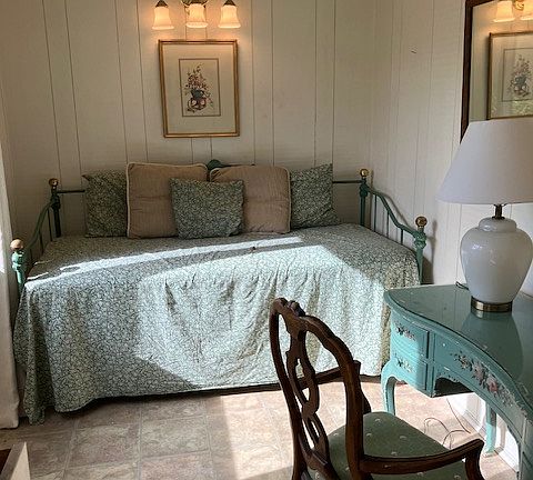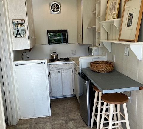 This charming Riviera Studio is nestled in the trees in a very secluded European courtyard setting with an ocean peek. A very large window overlooks the private sunny patio and courtyard with bubbling fountain and visiting birds. Bougainvillea and roses surround the yard. The space is very private and complete and well planned, featuring lots more storage than usual. It includes a small dressing area with both a floor to ceiling hanging closet and shelving. Plenty of southern light makes this a bright and cheery space. It features a private entry, a full bathroom with shower, a large sink and 6 feet of counter with under counter storage also, plus a built-in full height linen closet. There is over 8 feel of kitchenette counter with double sink, double gas burner, a small oven and refrigerator, and a microwave oven. You can prepare food or enjoy meals at the built-in counter with 2 stools or enjoy a meal outside on the patio. Partially furnished with a comfy day bed that converts to either two twins or a king bed, it is ideal for one person. There is plenty of safe street parking close by. Most utilities are included. Your kitty is welcome but no dogs please as this is an unfenced yard.