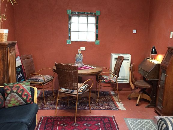 Peaceful, authentic and quiet, this two bedroom (plus sofa bed in living room), fully furnished (available unfunished at $100/month fee) and appointed home was built in 1939 in the old, Santa Fe Railyard neighborhood within walking distance to downtown and in the heart of the newest art district. All amenities including kitchen appliances, pots and pans, dishes and flatware, gas stove and microwave, refrigerator, bedding and towels.
