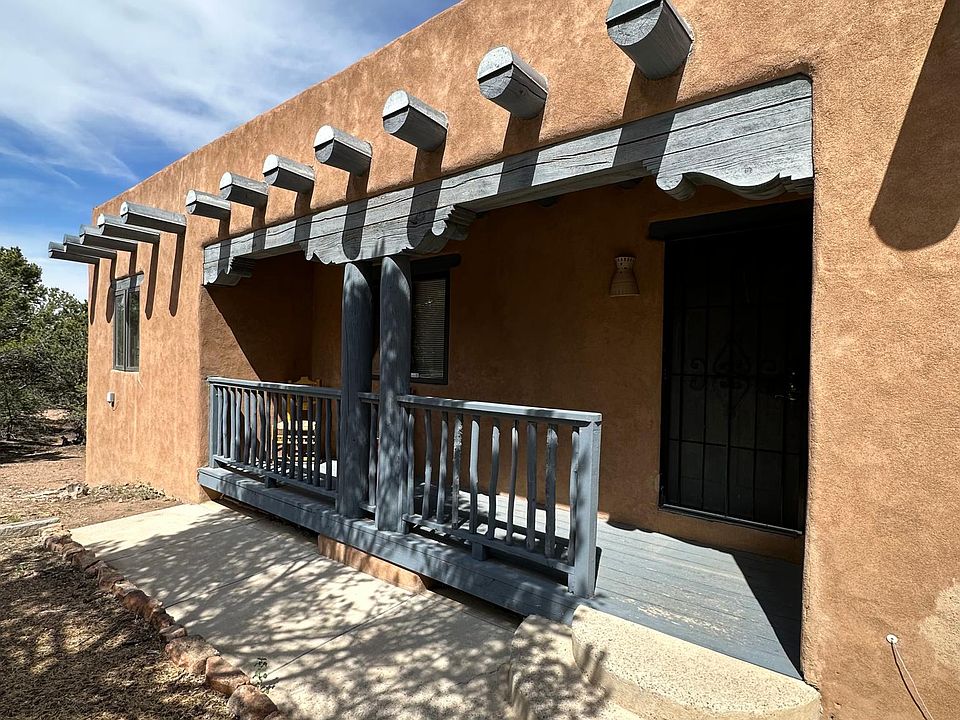 3 bedroom house with a detached double car garage, fenced back yard, 2 full baths, large master bedroom, laundry room, vigas, wood floors and ceilings, skylights, new washer and dryer, new refrigerator and dishwasher, new furnishings, new 65 inch smart TV, outdoor wood deck with patio table and chairs. Very private, quiet, natural landscaping. All utilities, high speed wifi and cable TV included for short term lease. One year term, tenant pays all utilities except water.
