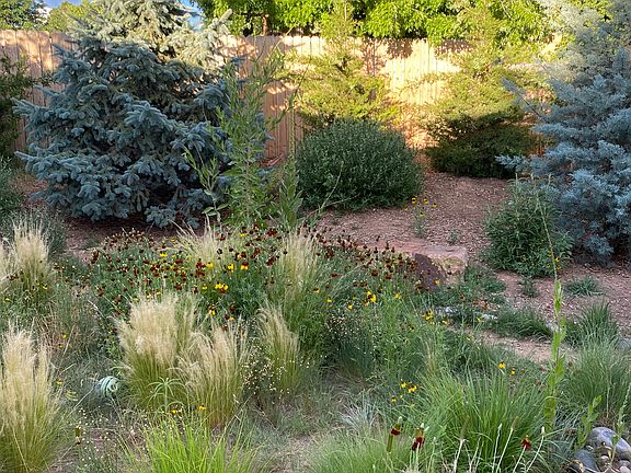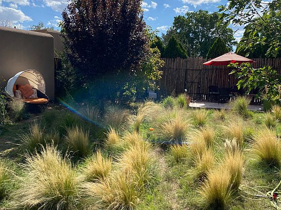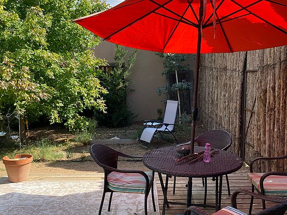 Peaceful, light-filled home in friendly neighborhood with gorgeous backyard for nature-lovers. Lots of places to sit and relax outside, a flagstone patio and a large deck, with native grasses, flowers and trees throughout; irrigation system, fully fenced. Perfect for nature-lovers and gardeners. Irrigated vegetable patch ready and waiting for you. Very quiet and private yet close to everything. Attached one-car garage, W/D included. Lovely saltillo tile flooring throughout, colorful Mexican tiles in kitchen with newer stainless steel appliances, including dishwasher. Full bath with additional sink/vanity in master bedroom. Lots of storage, large driveway. Great location, very central, across the street from Frenchy's Field and the River trail in charming Pueblo Alegre neighborhood; about 10 minutes from downtown. Well-behaved dogs considered, no extra fees required. Sorry but no cats. Absolutely no smoking or vaping. Owner pays for partial water and occasional yard maintenance; other utilities are tenant's responsibility. One year lease. Please tell us about yourself when you reply. Available mid-October, some flexibility. Rent is $2500 per month. Refundable damage deposit of $2500. First & last month's rent due on move in (last month's rent may be paid in installments). Good luck on your home search! One year lease. Owner pays for partial water and occasional yard work; tenant pays for additional water, gas, electric, wifi. Deposit and last month's rent due at move in. No smoking or vaping. Dog considered. No cats.