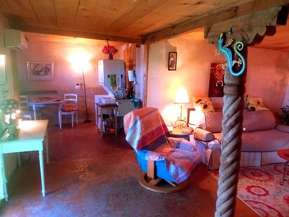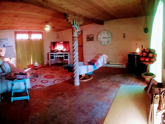 20 minutes from the so side via SR 14 aka the Turquoise Trail. On the way to famous Ol' Madrid, 15 minutes south, where the Turquoise mines gave the road its name. Paved roads to the property. The views Sunsets! Walk to Horse Riding lessons! and plenty live stock & 30 minutes from downtown. One well behaved dog ok, no cats.