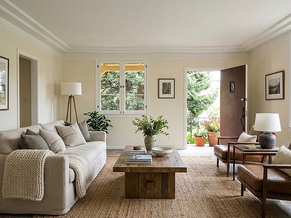 Three generous bedrooms feature vintage French windows, new carpeting and faux wood blinds. In-unit washer/dryer, ample closets and detached one-car garage complete the home.