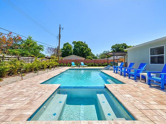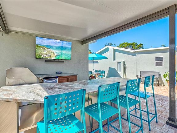 Welcome to the Ringling Retreat, a luxurious family compound in the heart of downtown Sarasota. The property sits just a few blocks from the East end of Main Street downtown and is perfectly walkable to the Legacy Trail, Payne Park, & a number of shops & restaurants. A screened entryway in the front greets you before stepping through the front door into a light and bright living area with views out to the new heated pool & generous seating including a queen sleeper sofa & two club chairs. A 65 inch mounted tv in this room w/ complimentary streaming services is accessible from the living room as well as the 3 stools at the breakfast bar separating the living space from the designer kitchen. The kitchen offers SS appliances & European style cabinets that are all labeled for your convenience & offer soft close hardware. Adjacent to the kitchen is a large dining area with seating for up to 12. The main house offers 3 large bedrooms & 2 well appointed bathrooms. The bed configuration is as follows: Bedroom 1 is just off the living room and is separated by french doors with privacy curtains. This room offers sleeping for up to 4 guests w/ two stand alone twin beds as well a twin over twin bunk bed. An open shelf closet, nightstand and mounted tv complete the set up. Bedroom 2 is located on the Master wing of the house with good separation from the Master bedroom and with easy access to the guest bathroom. This room offers a queen bed with two nightstands, a dresser and a large reach in closet. A large flat screen tv sits on top of the dresser. The Master bedroom is huge and offers a king bed with two nightstands, a dresser and a mounted tv on one of two shiplap accent walls. The Master has a zen feel and offers a large walk in closet, separate water closet/toilet area, and a recently remodeled spa-like bathroom with tiled shower, and double vanity sinks. Access to the courtyard & pool area is available from the Master. Step beyond the kitchen & dining area to an exterior covered breezeway to find a laundry closet to the right as well as a beach essentials closet to the left. The keypad enabled door between both closets grants access to the guest house which features a full living room w/ two large sofas including a queen pullout sleeper sofa as well as two club chairs. Adjacent to the living area is a full kitchen & eat-in kitchen area as well as a 2nd washer & dryer. Beyond the living space is a large bedroom w/ King bed, 2 night stands & mounted flat screen. This 2nd Master offers a walk in closet & full en suite bathroom. Beyond the breezeway & into the courtyard you'll find a large glistening pebble tec heated saltwater pool w/ an in-ground heated spa and large sun shelf that allows you to stay dry with your toes in the water. Two in-pool club chairs offer cupholders for your cold beverages as you soak up the Sarasota sunshine. Need some shade? We installed a Miami Dade hurricane rated patio with covered roof and an outdoor kitchen and bar area offering ample counter space and cabinetry, a mini fridge, and a premium 40" propane grill. 4 stools face the mounted TV so you can watch the game while your loved ones play nearby. Outdoor dining can be had either at the outdoor kitchen bar or the dining table with seating for 8 under a teal Sunbrella. On the far side of the pool you'll find a gorgeous putting area for golf enthusiasts and children alike. New landscaping and landscape lighting make this feel like a resort at night.