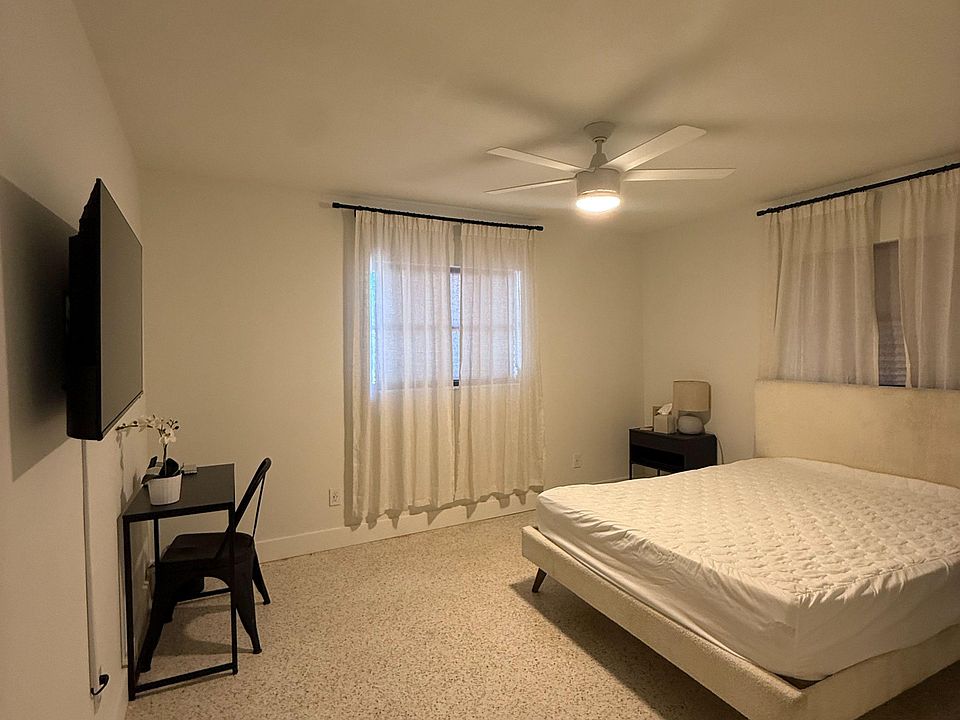 Prior living room next to front door entrance. Large window facing front of house. Full size bed/ mattress protector, night stand, desk, desk chair, new Tv on wall, ceiling fan with light/remote. Room has (2) blackout curtain walls floor to ceiling to enclose the room (no wall/ no door/no lock).