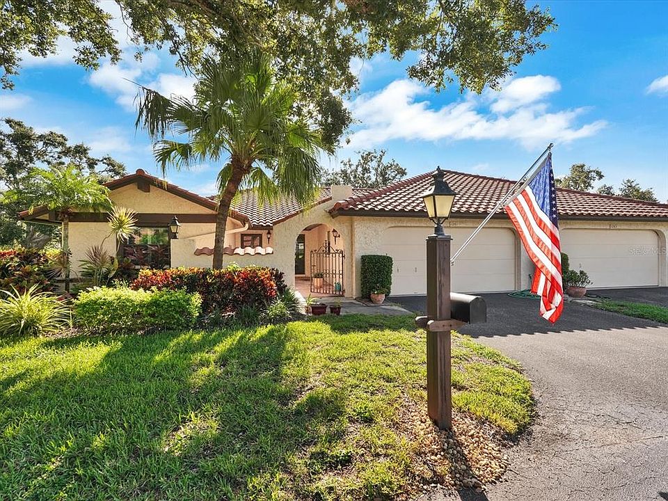 One or more photo(s) has been virtually staged. New listing on Golf Point Way in desirable Golf Pointe. Maintenance free Golf Pointe Community. Less than fifteen minutes from downtown Sarasota and minutes from the UTC Mall and Benderson Park with water activities. A spacious Villa with over 2100 square feet including two large bedrooms plus den along with a Florida room. Beautiful water view from the living room and patio. Tile roof replaced in 2018 which is maintained by the HOA. Updated kitchen as well as both bathrooms, custom shelving in both bedroom closets, custom shelving in garage, custom epoxy flooring in the oversized garage; updated front storm door; hurricane windows throughout in addition to custom window treatments over all windows. Enter through a private courtyard upgraded to tile like concrete. Great for a BBQ’s and outdoor seating. Golf Pointe residents enjoy well maintained grounds, green spaces, and two heated pools. Optional Palme Aire Country Club with two outstanding challenging courses (Palm course under complete renovation, ready for play in December) Seven tennis courts plus Padel and Pickleball courts. Fitness center Tennis Pro shop as well a Golf Pro shop staffed by PGA Pros. HOA fee covers roof, landscaping, basic cable, making for easy maintenance free living. Located near I-75 near University Parkway. Close to many wonderful beaches, tons of dining options and shopping; close to Sarasota/Bradenton International Airport. Perfect for seasonal or year- round living. Make an appointment soon!