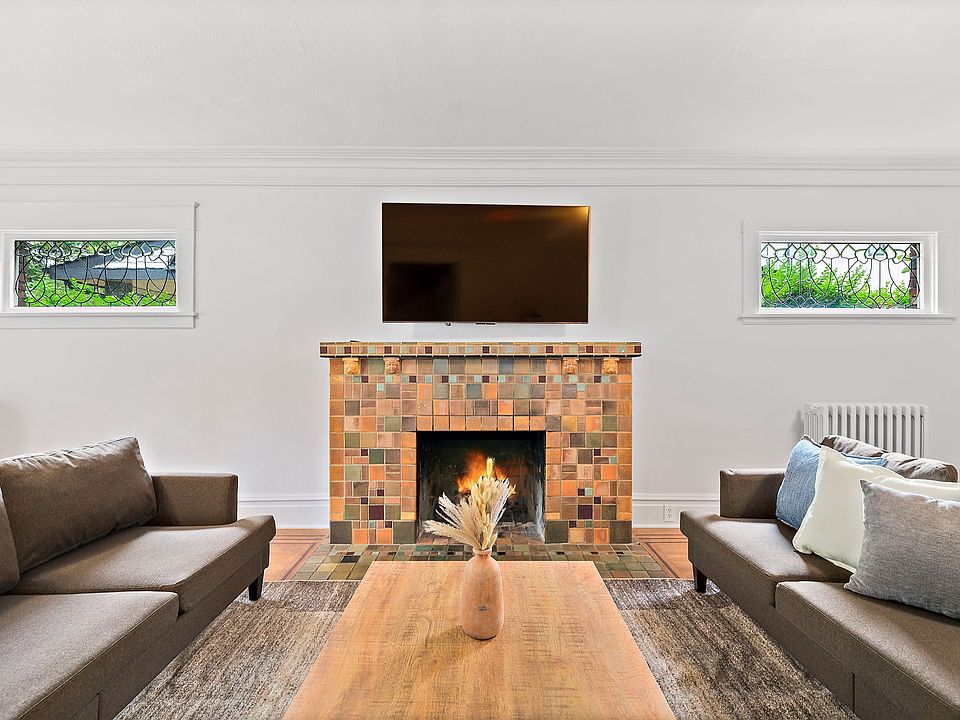 Cozy tile fireplaceFully stocked kitchenRich architectural detailsHigh-speed wi-fiWalk-in closetElegant millworkBalcony access