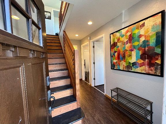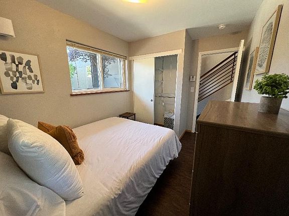 The home sits at the end of the driveway, where youre free to park; The last 4 digits of your phone number provide access, and you enter to 2 beautifully appointed Queen bedrooms on your right, a full bathroom ahead boasting a ceiling-mounted rain showerhead, and full laundry facilities. Up the stairs, enter the vaulted Great Room, complete with stainless gas Fireplace, Bosch/Miele-appliance appointed kitchen, luxury Italian leather sofa, private deck, and half bath for your convenience.
