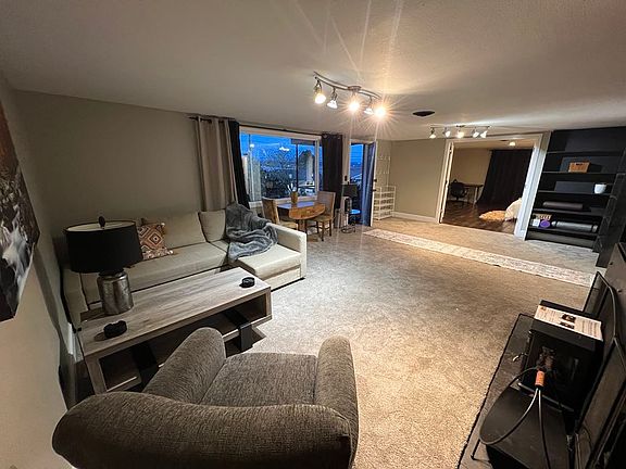 Living room/dining/entry: Functional fireplace and decorative fireplace. 55 inch smart TV, sleeper sofa that is a sectional, dining table with chairs for 4, entry shelf for shoe and leash storage, accent chairs, big lake views.