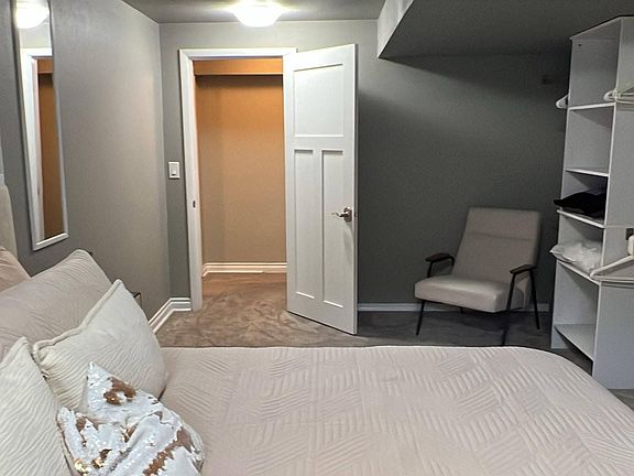 Primary suite: Approx 11x16. Carpeted, king bed, storage, closet, full length mirror.