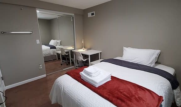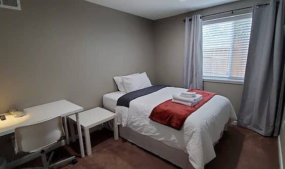 This private bedroom with a 10 sqft wardrobe and a view is a newly furnished full-size bed with a firm mattress. The room is provided with a blackout curtain, a lounge chair, a working desk, and an ergonomic working chair. A 43" smart TV with a built-in Roku is also provided for your entertainment privacy.