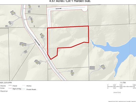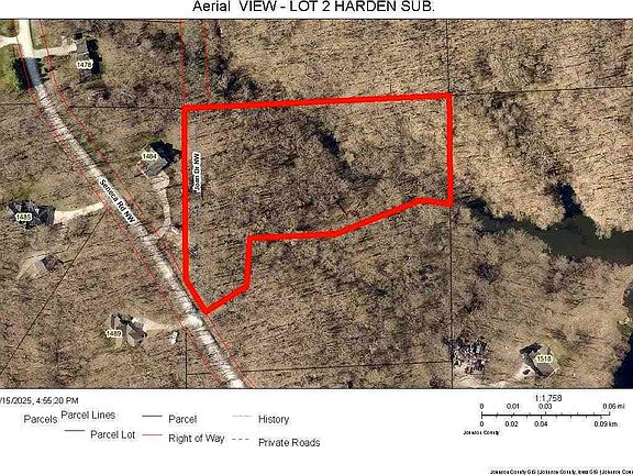 Rare find! This is one of 2 very nice heavily wooded walkout lots nestled into mature native Iowa timber in a secluded area off a dead-end road. The building sites have already been cleared, and a partial trail cut into the timber. Located approximately 14 miles to Cedar Rapids or Coralville, and just minutes to the Coralville Lake & Recreation areas. Electric will be ran to each lot’s property line, and the future private well & septic to be installed by Buyer. There will be minimal covenants. Lot 1 is 4.76 Acres and Lot 2 is 4.91 Acres