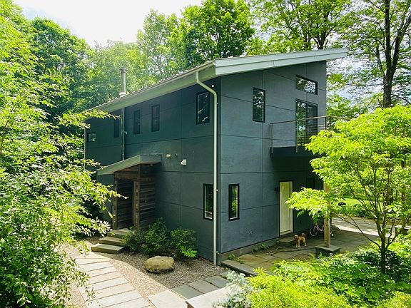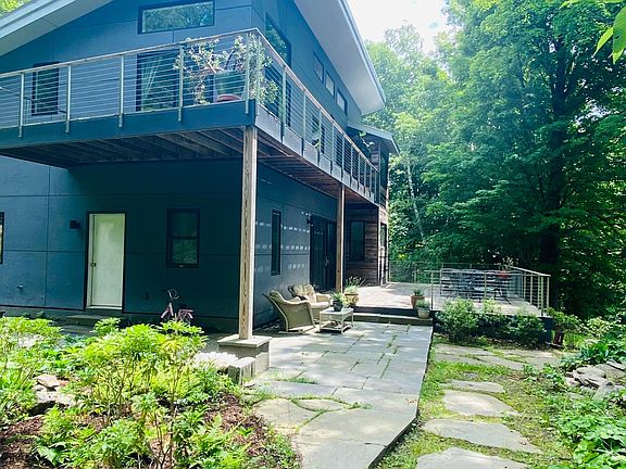 Private Woodstock Retreat on 14 majestic acres. New modern home boasts spectacular mountain views, a private swimming hole, hiking trails, streams, ornamental and vegetable gardens, and fruit trees. The two-bedroom house comfortably sleeps 4. The primary bedroom has a balcony, king canopy bed, walk-in closet that can also be used as a private office, an en suite bathroom with a shower, clawfoot tub (soak in the views of Mt. Guardian from the tub) and double vanity. The second bedroom an en suite bathroom with a shower, a twin loft bed and a separate twin bed. The open mezzanine on the second floor can be used for an additional guest sleeping space, an office, yoga/exercise studio (with Iyengar yoga rope wall), or play room with access to the wrap around balcony.