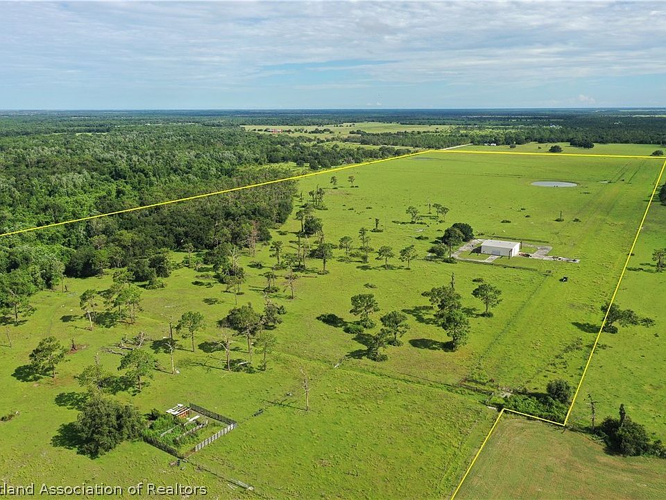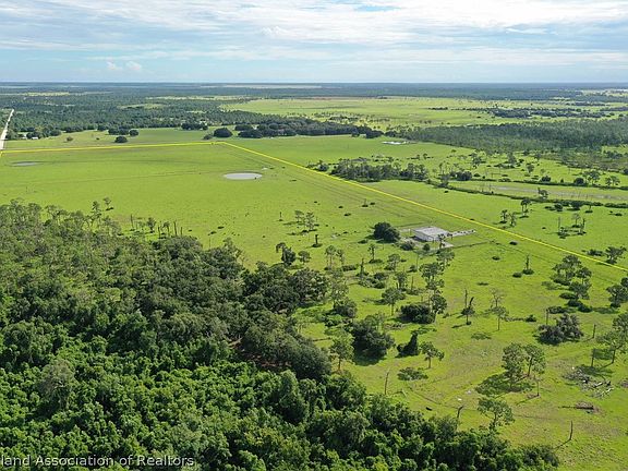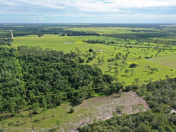 Fly-in 122+-Acre Ranch Retreat with 4000+-SF Hangar bahia pastures fenced & cross fenced, cattle pens. Surrounded with ideal wildlife sources:lush high protein hay fields to south, heavy woods to east & large tracts to west. 1000+ft paved road frontage. Perfect for home site in oak hammock behind air hangar then develop in future with five 20+acre fly-in ranchettes keeping your premium home site in back or sell for more potential profit.